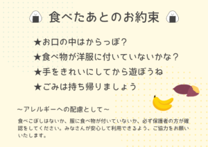 ・おやつスペース開放時間 9:30~11:10/13:30~15:10*終了時間までに食べ終わるようにお願いします